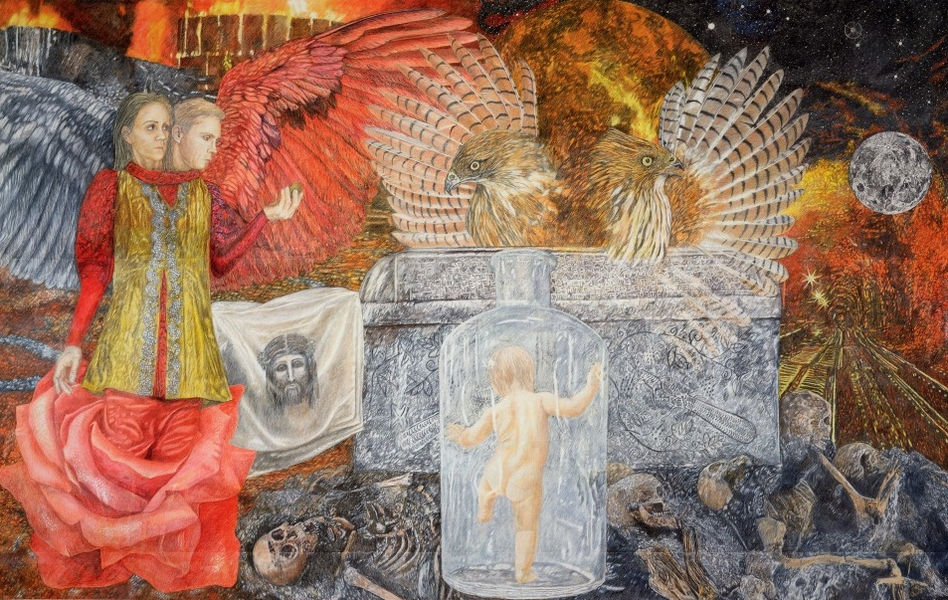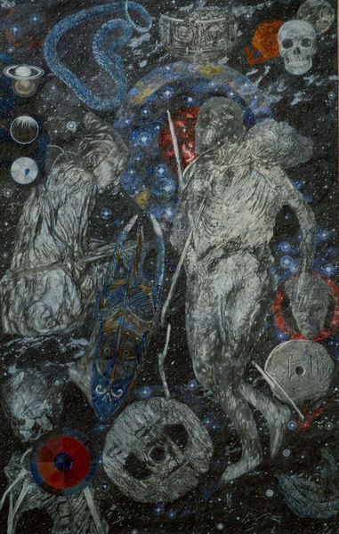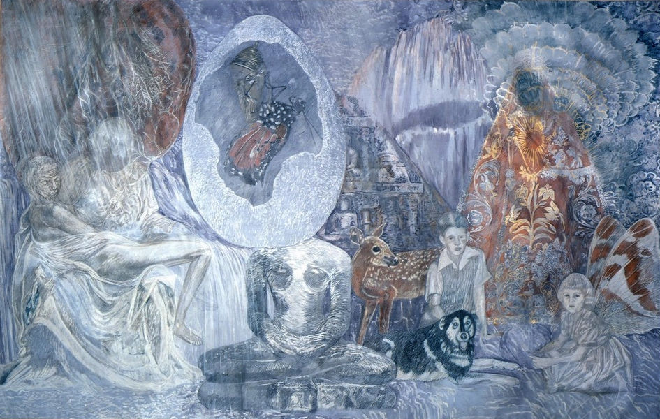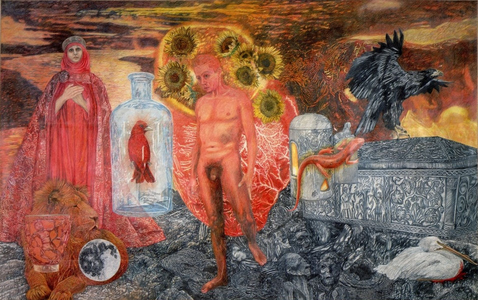 Ann McCoy was born in Boulder, Colorado in 1946. She is of Irish Catholic descent and this often informs her work. She is deeply studied in alchemy, and many of her large wall sized drawings in coloured pencil have alchemical themes. She is much influenced by Jungian ideas on alchemy.