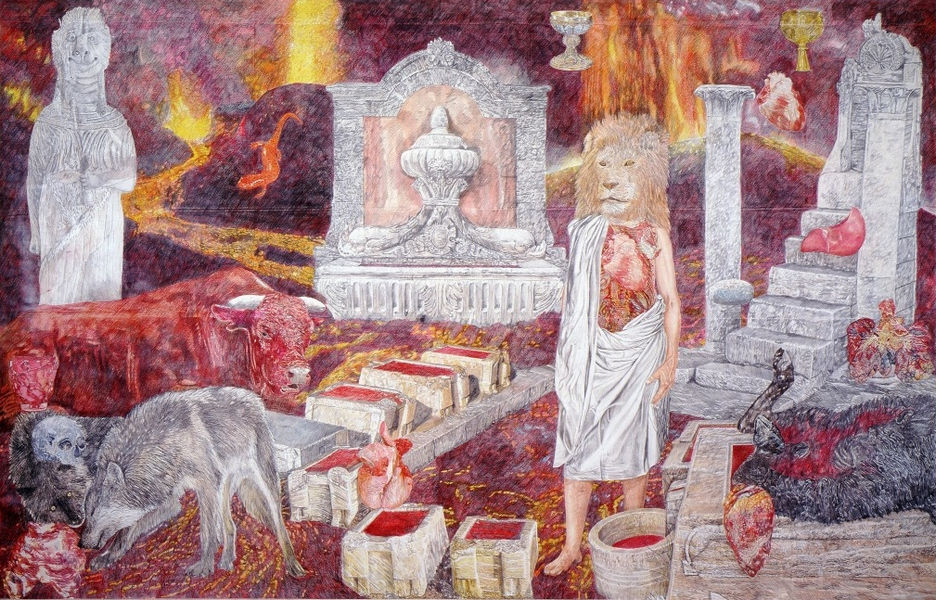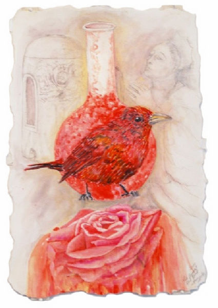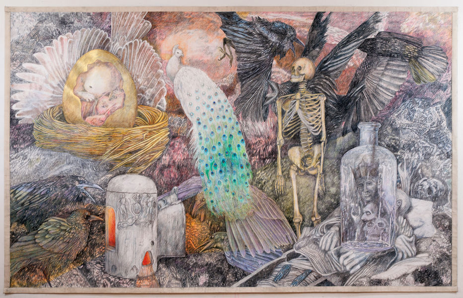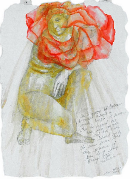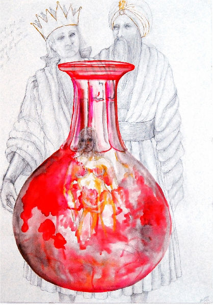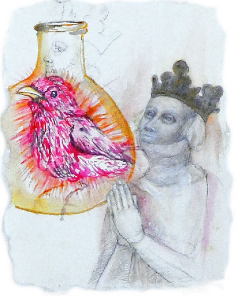 In 2008 she created the Pfaueninsel Castle project, eight large artworks in watercolor and pencil on paper. This arose from a journey she took to an island off Berlin called Pfaueninsel (Peacock Island). The island was the home of Johaan Kunckel an alchemist who made red glass. There is a rather good article on the Pfaueninsel Castle and the fairy tale, or alchemical allegory, she wove around it.