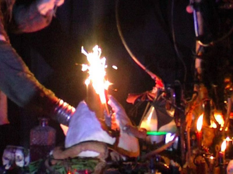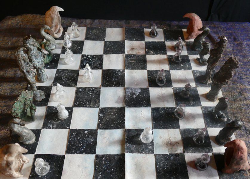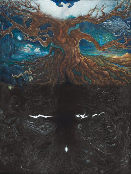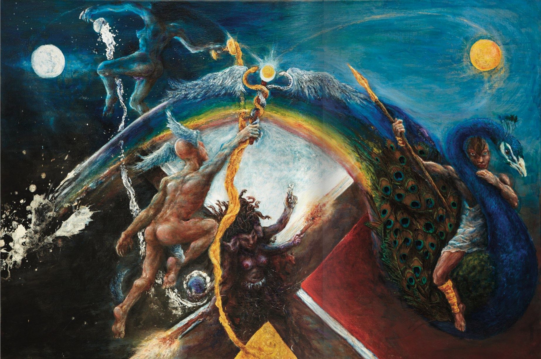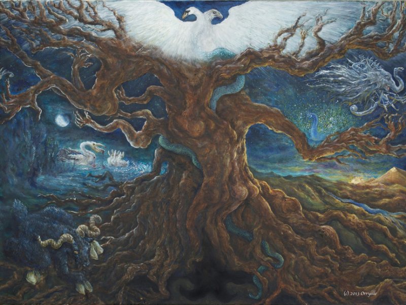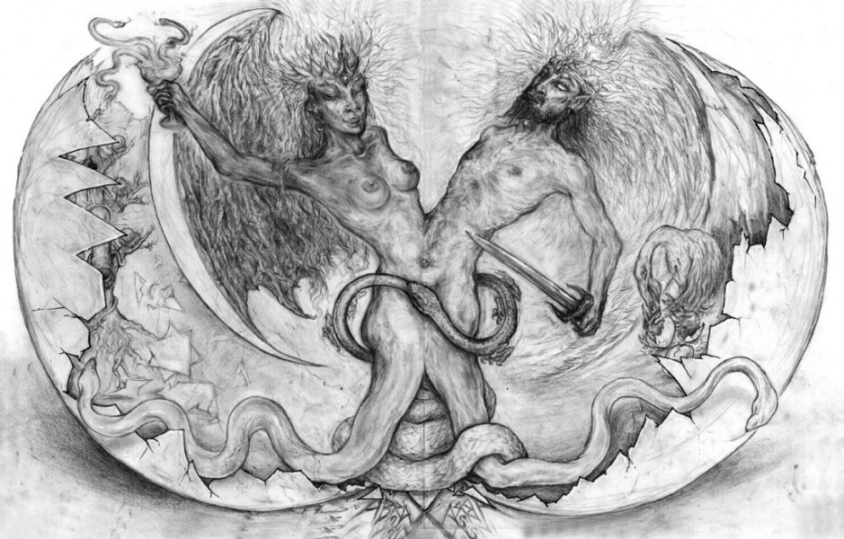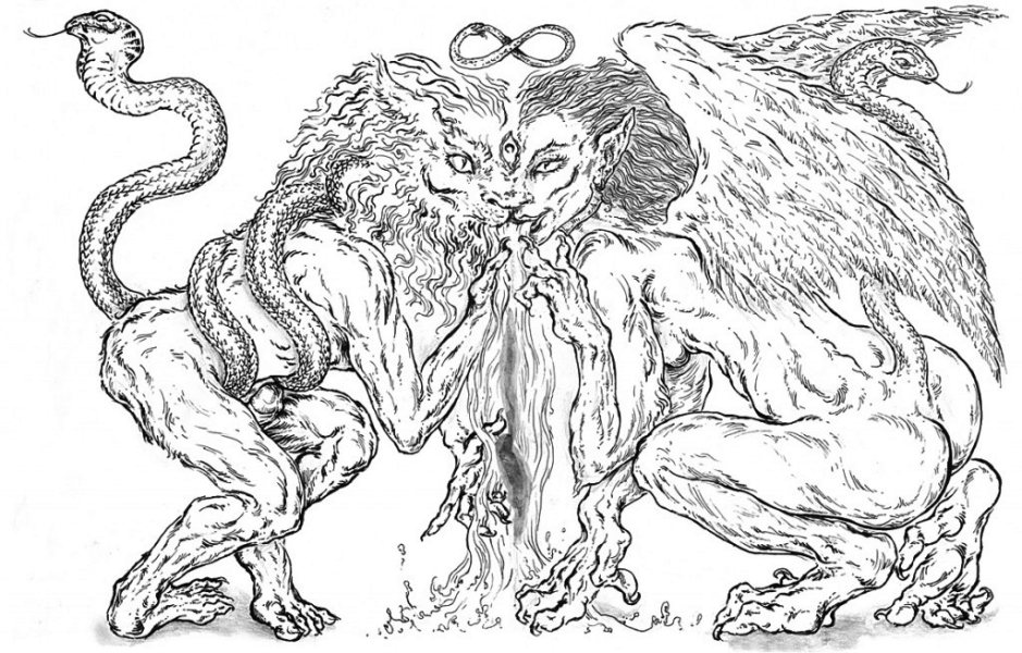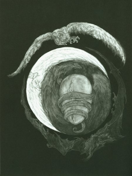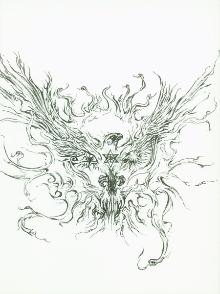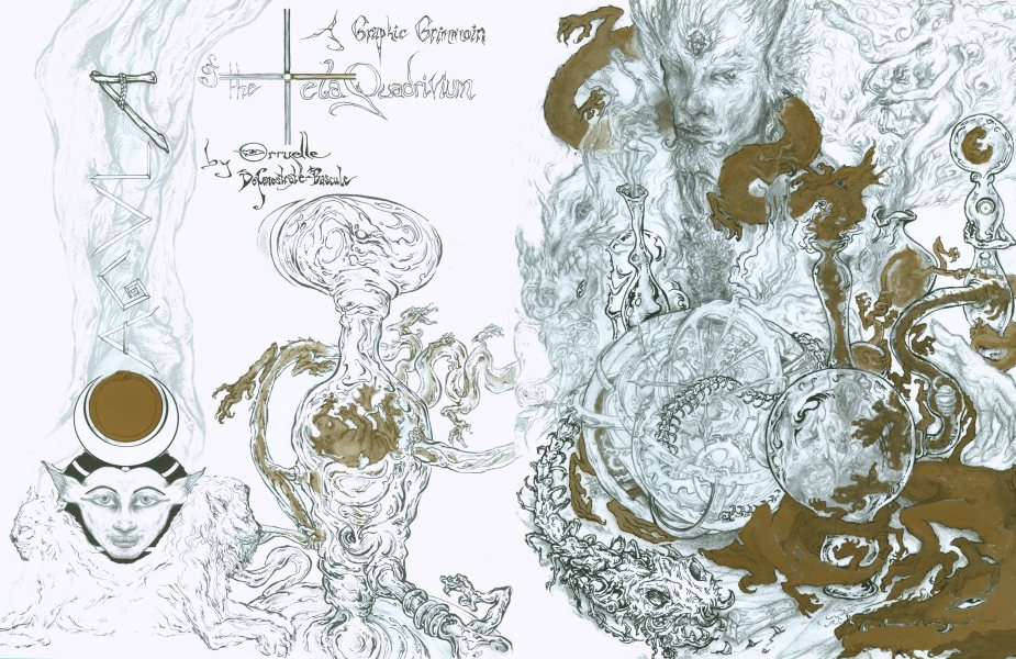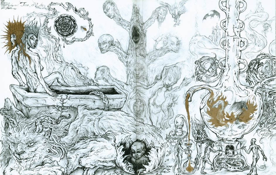 Orryelle Defenestrate-Bascule is an Australian artist, sculptor, writer and performer, who is much influenced by esotericism, magic, Eastern mythology and alchemy. His alchemical artwork can primarily be found in a series of four lavishly illustrated volumes Conjunctio 2008, Coagula 2011, Solve 2012 and Distillatio 2015 (published by Fulgur Limited in the UK), and some other drawings can be found in Silkmilk, a journal of esoteric art which he edited from 2003 to 2010. He has also created an alchemical chess set and uses alchemical imagery and installations in the various ritual shamanistic theatre productions he organises. His skill at drawing is very obvious and he infuses his drawings with very powerful and engaging imagery, derived from his deep grasp of mythological and occult ideas. There is usually a narrative and underlying set of ideas to his artworks, and in some cases he articulates this using poetry and text. He is clearly one of the most significant artists in the early 21st century working with surreal and occult imagery and extending this into his own particular graphic language.