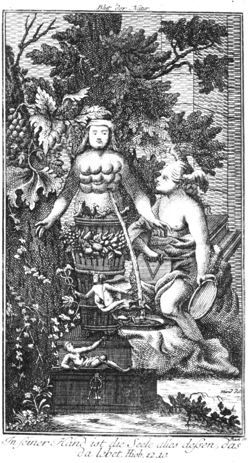 Emblematic Frontispieces Das Blut der Natur, Oder Entdeckung des Allergeheimesten Schatzes derer Weisen, Seyende nichts anders als der rothe Lebens-Safft, davon alle Geschöpffe nach dem Willen des Allmächtigen herstammen, erhalten, und fortgepflantzet werden. Denen Kindern der Weissheit zum Besten hervorgegeben von Anonymus von Schwartzsfuss, contained in Fünff curieuse chymische tractätlein Frankfurt, 1757. Back to emblems page