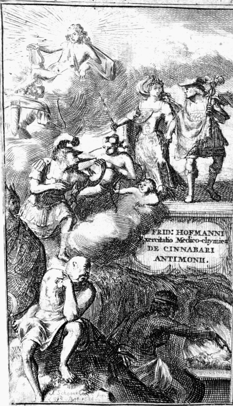 Emblematic Frontispieces Friedrich Hoffmann. Exercitatio medico-chymica de cinnabari antimonii, Eiusque eximiis Viribus, Usu tam secretori quam vulgari tam in Morbis huc usque cognitis quam incognitis. Adjecta sunt Experimenta ac Ratiocinia varia curiosa. Lugduni Batavorum, apud Petrum Vander Aa, Bibliopolam, 1685. Back to emblems page