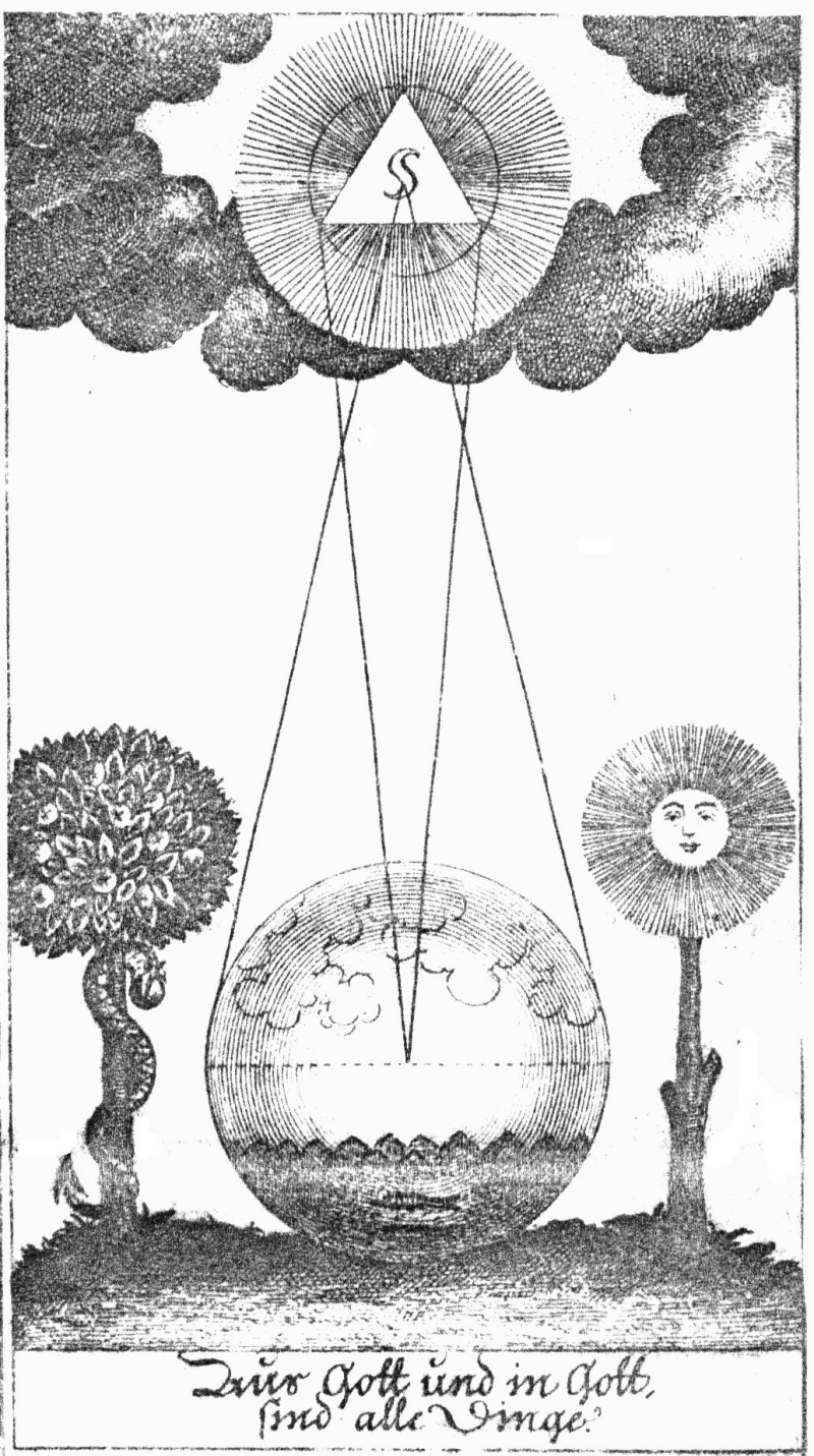 Emblematic Frontispieces Johann Gottfried Jugel [1707-1786]. Von der Scheidung der Vier Elementen aus dem Ersten Chaos, und wie nach deren eingepflanzten Liebe eines in dem andern unaufhörlich seine Würkung verrichtet, aus deren Qualitäten so vielerley Ausgeburten in allen dreyen Reichen zu Tage gebracht werden, zusamt, wie die Quinta Essentia solcher Würkung der Mercurius Universalis, als die Prima Materia all geschaffenen Dinge, Sowol in truckner als liquider Gestalt ganz rein, lauter und unverfälscht daraus zu erlangen sey. Allen Liebhabern natürlicher Geheimnisse zu einem Grund ihrer Erkenntniss geleget von I.G.I. Einem emsigen Erforscher derselbigen. Berlin, bey Johann Andreas Rüdiger, 1744. Back to emblems page