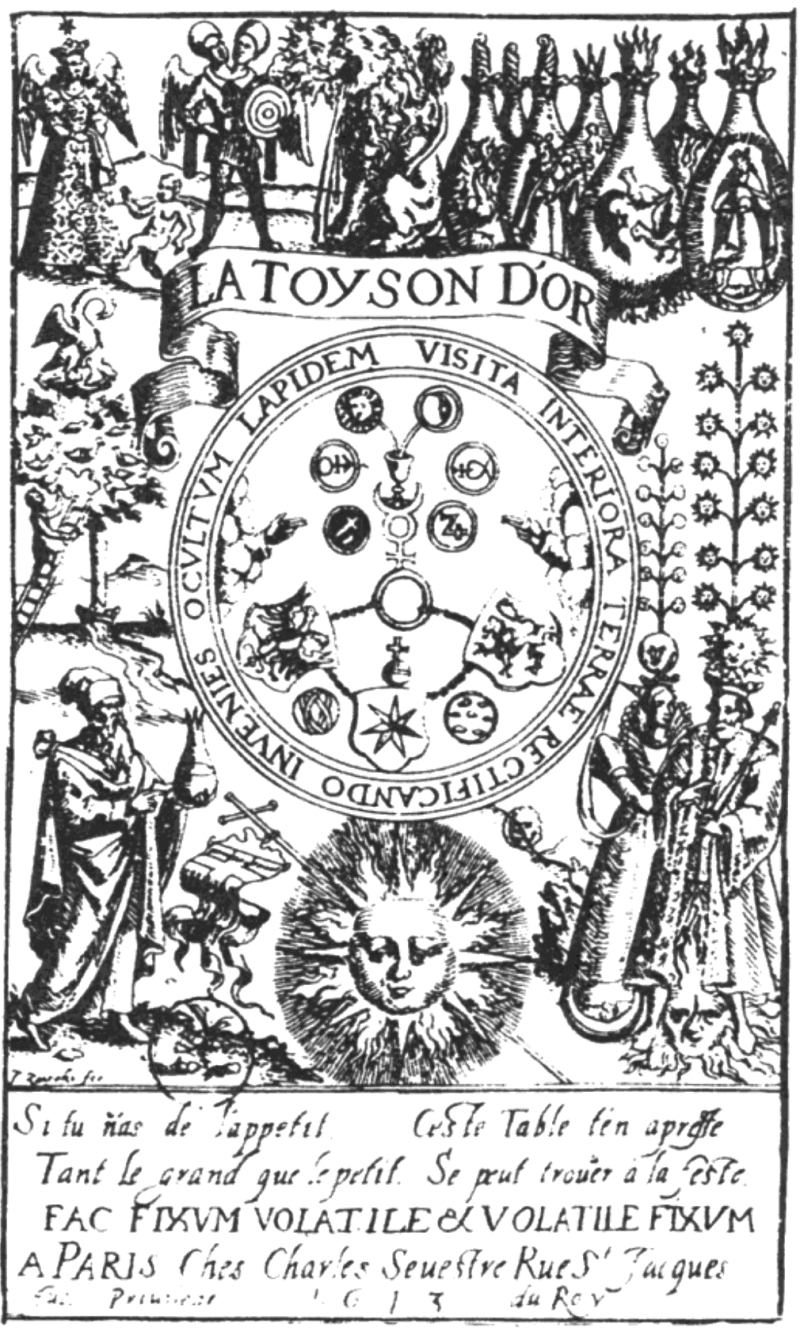 Emblematic Frontispieces Salomon Trismosin, pseud. La toyson d'Or ou la Fleur des Thresors, en laquelle est succinctement et methodiquement traicté de la pierre des philosophes, de son excellence, effects et vertu admirable. Plus de son Origine, et du vray moyen de pouvoir parvenir à sa perfection. Enrichies de Figures, et des propres Couleurs representees au vif, selo qu'elles doiuent necessairement arriver en la pratique de ce bel Oeuvre. Et recuellies des plus graves monuments de l'Antiquité, tant Chaldeens, Hebreux, Aegyptiens, Arabes, Grecs, que Latins, et autres Autheurs approuvez. Par ce Grand Philosophe Salomon Trismosin Precepteur de Paracelse. Traduict d'Alemand en Franççois, et commenté en forme de paraphrase sur chasque chapitre par L. I. Paris: Charles Sevestre, 1613. Back to emblems page