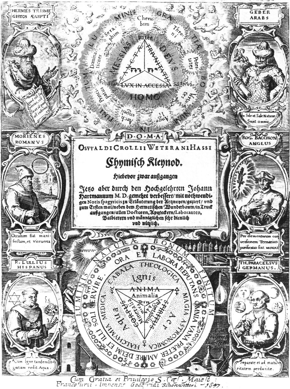 Alchemical Imagery - illustrated title pages Oswald Croll Chymisch Kleynod. Hiebevor zwar aussgangen jetzo aber durch den hochgelehrten Johann Harmannum M.D. gemehrt verbessert, mit nothwendigen Notis spagyricis zu Erläuterung der Artzneyen, geziert. Frankfurt, 1647. Back to Emblems on title Pages