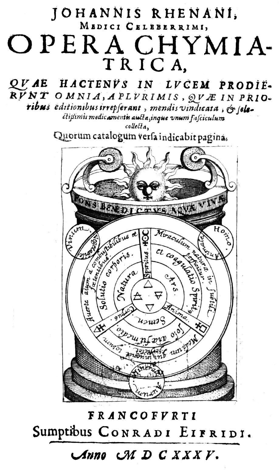 Alchemical Imagery - illustrated title pages Johann Rhenanus Opera chymiatrica, quae hactenus in lucem prodierunt omnia, a plurimis, quae in prioribus editionibus irrepserant, medis vindicata, et selectissimis medicamentis aucta, inque unum fasciculum collecta, quorum catalogum versa indicabit pagina. Francofurti: sumptibus Conradi Eifridi. 1635. Back to Emblems on title Pages