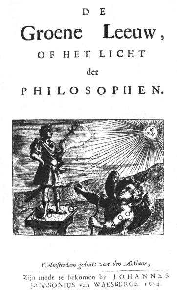 De Groene Leeuw, of het Licht der Philosophen; Vertoonende alle Koninklijke Handelingen in het openen en ontsluiten der Metalen, Mineralen, Vegetabilische en Animalische saken, het onderkennen van hare Natuur en Souten, seer dienstig tot vele vele heerlijke Medicynen, tot verscheide schoone Verwen en Tincturen, en meer andere nutte voortreffelijke werken der Konst, uit eigen ondervinding gustig voorgestelt, door Goosen van Vreeswyk, Berg-meester. Met vele noodige kopere platen verciert. Jansson, Amsterdam, 1674.