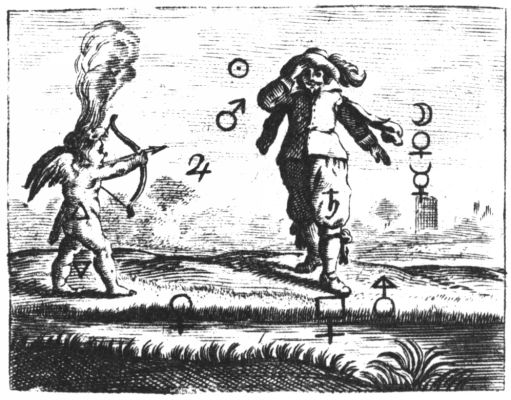 These images were taken from a well known Dutch emblem book of Jacob Cats which had gone through many editions before van Vreeswyk found these in the edition of 1659 printed in Dordrecht. The printer of the van Vreeswyk books, must have obtained the original engraved plates and added the graphic symbols for alchemical substances.