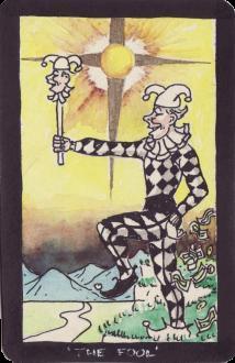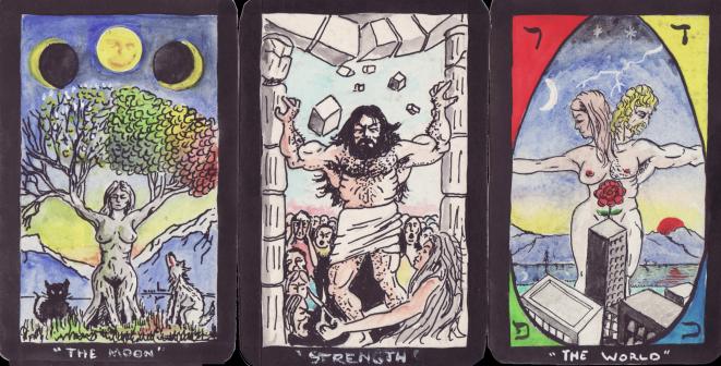 Other cards in his Majors explore a less convention depiction of the established imagery. The Moon card has the classical image of Daphne transformed into a tree and here the leaves show a growth and ripening process through their colour changes. We note the black cat and white dog and the three phases of the Moon. Strength uses the image of Samson in the Temple, while the World incorporates an hermaphroditic figure