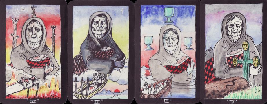 The Minor Arcana. In many decks the Minor arcana fail to engage. Often they are not emblematised or merely repeat the imagery used by Pamela Coleman Smith for the Waite deck. Some artists stride out on their own path and create new individual images for the pip cards, but often these do not cohere or present a unified narrative. Ellaby here creates a coherent set of images through the four suits, which he derives from his deep study of the kabbalah. It is perhaps only when one lays these out in rows that the structure can best be seen. ![]() To Ellaby, the ten pips are associated with the ten sephiroth, from one (Kether) to 10 (Malkuth). He has chosen a motif for each sephirah and then explores these through the four elements or worlds that constitute the suits. These is so much symbolic detail compressed into these images that I cannot analyse them all here, but I will merely take two examples. First let us look at the "Threes". ![]() The third Sephirah is Binah, sometimes seen as 'Understanding'. Binah is thought of as feminine, and here Ellaby uses an image of the wise old woman, the crone. On the lower left the soul is seen being transported and transformed through fire, air water and earth in the four suits.