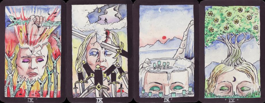 The ninth Sephirah is Yesod, often called 'the Foundation'. Ellaby pictured this using an image he often returns to in his paintings, that of the open living skull. From this open brain pan, fire emerges in the suit of wands, in swords the skull is cleaved open and air emerges. In the Nine of Cups, the open skull is a well from which streams of water flow forth, and in the suit of the Earth element, Pentacles, the nine shows a tree growing out of the skull. The tarot of Robert Ellaby is a coherent exploration of the conceptions behind the 78 cards, seen through the kabbalah and his own surrealist creativity. |