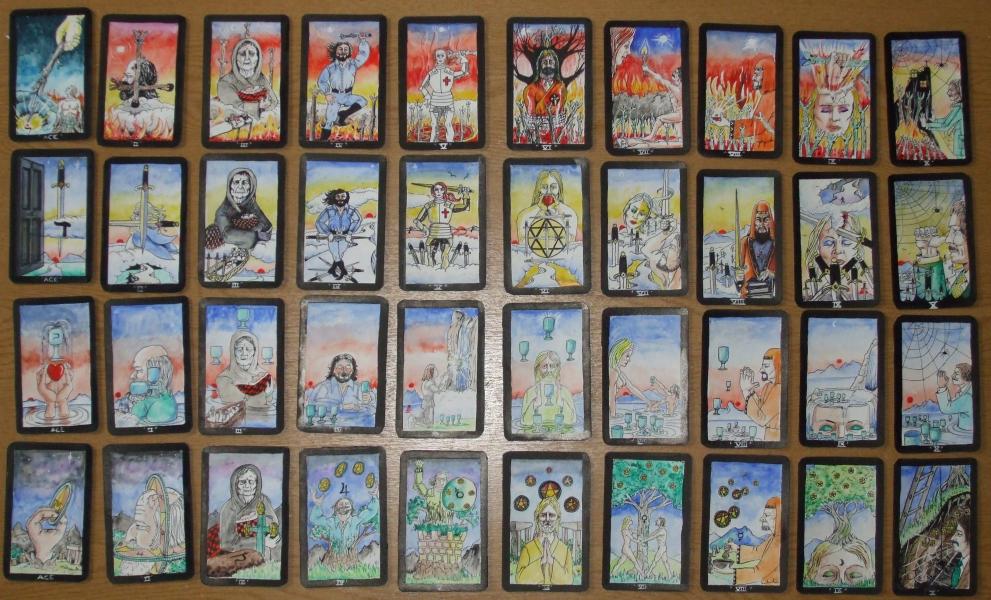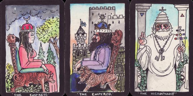 The Tarot of Robert Ellaby Robert Ellaby is a British surrealist artist much influenced by esotericism and kabbalah. I am pleased to own one of his paintings which I commissioned from him on the theme of the Splendor Solis. I also have scans of one of his series of artworks the Cosmic Christ which I placed on my website. In the 1980s Bob worked on designs for a complete tarot deck. For him this was an exercise in creating a unique series of images that reflected a kabbalistic structure to the sequence of tarot images. I do not think he ever thought of having the deck published. This is a full 78 card deck and each of the pip cards is emblematic. In this deck the pip card system is particularly important as it reflects a kabbalistic structure. Unlike many kabbalistic decks which resort to numbers, Hebrew letters and various abstract esoteric correspondences, here Bob Ellaby has absorbed all this material and recreated the essence in a emblematic form. The artwork is created with pen drawings which are coloured with thin washes of water based pigments. The Major Arcana. For the most part Ellaby has, in his Major arcana, held close to the conventional images, though realised in his own style, and incorporating little flourishes and details. He does not use decorations but each symbol depicted is a considered part of the image. Note, for example, the arms and backrests on the thrones of the Empress and Emperor, their crowns and the fact that they face in opposite directions.