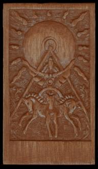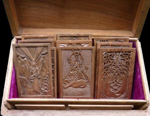 The "deck" consists of 22 plaques of walnut about 1/4 of an inch (6mm) thick and around 3 1/2 inches (88mm) high by 2 inches (50mm) wide. These were smoothed and polished and the carving made in low relief in an off-centred window set into the upper surface. This offsetting of the carved area immediately gives the impression of a tarot card with space at the bottom for text. There is no card title or number but as the designs closely reflect the established tarot arcana there is no problem in recognising the arcanum being depicted.
