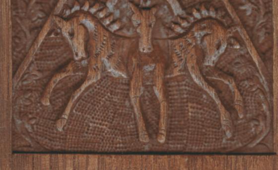 Here we can see this tooled background on the Sun plaque. Here we can see another feature of the carving, the higher foreground of the three horses and an intermediate layer of vegetation (here towards the right and left edges) lying between this and the background. Ths subtle feature helps give a sense of depth to the imagery.