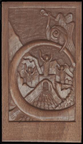 This creation of layers to give depth to the image is perhaps carried to its full extent in Judgement. Here we find the spiraling circular energy form closest to us, with a path to a gateway into a graveyard behind, and behind this the figures arising from their tombs with mountains set behind them and finally the background sky with the trumpeting angel upon it. The carver controls our perception of depth and locates these different elements within the space of the emblem.