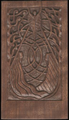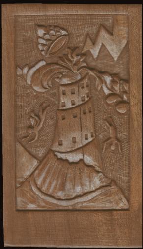 The image stands out from a background which is textured with a punch hammered into the carved away surface. The forms of the image are for the most part smooth, being cut by a sharp chisel, and perhaps later burnished. Walnut is a hard wood with a fine grain, and it thus supports fine relief lines, which are stable and not easily damaged, as they can be on softer or more coarsely grained woods.