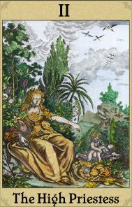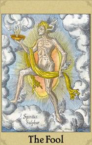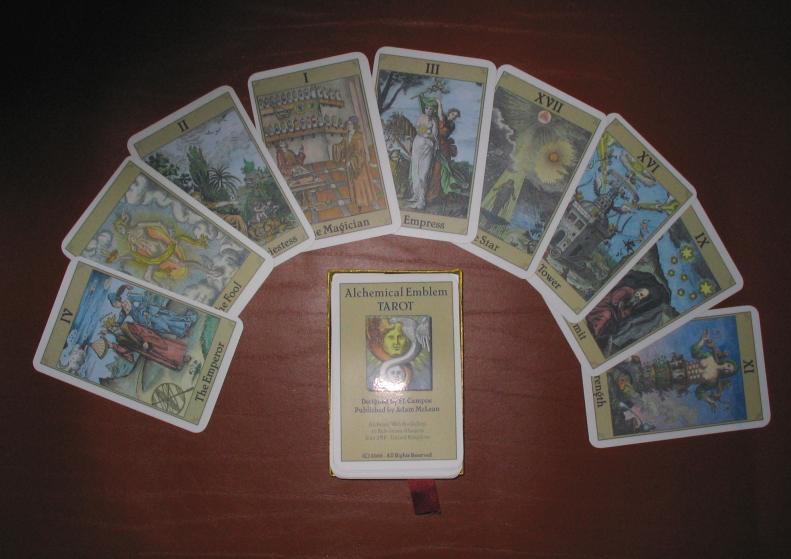 This tarot deck was created by the prolific tarot designer F.J. Campos. He is well known on the Orphalese Tarot system for the dozens of interesting decks he has produced as computer images. For this deck he took the alchemical emblems which I had coloured over the past decades and used them to represent the imagery for this tarot deck. I was not involved in any way in these assignments of emblems to tarot images, but F.J. Campos does not need any advice on these matters as he readily finds symbolic associations and is very adept at manipulating the images.