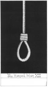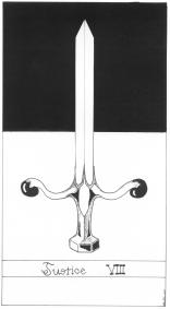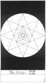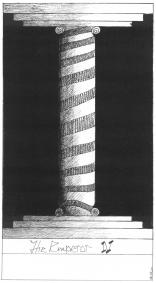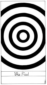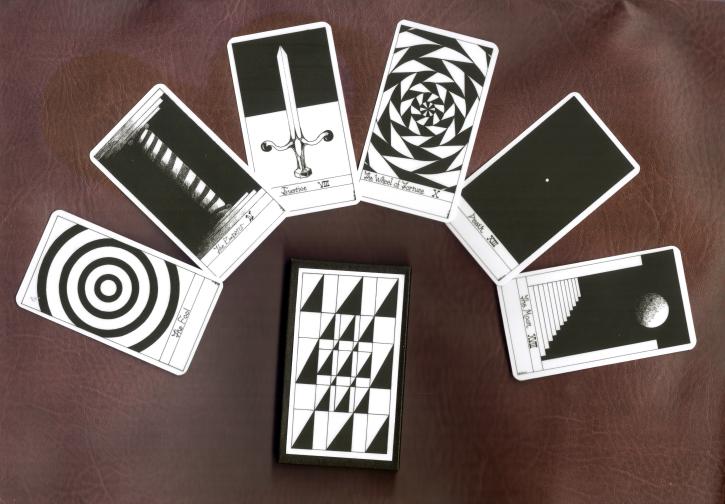 Peter Rotin's tarot is in black and white. It is primarily an abstract deck reducing the imagery of each arcana to a minimum while still retaining their essence and power. His deck also works with the polarities of dark and light, and the ways in which they weave together to give form and substance to the ideas. Thus the Emperor is minimalised to the idea of the column linking the earth and the heavens. The Fool is a series of four concentric circles, the outermost of which is broken by the frame, perhaps indicating the danger and loss of focus on the centre that the Fool finds on his journey. Though these images are minimalist they are not simplistic and a great deal of thought has gone into structuring the deck. Peter Rotin's fine sense of line and geometry makes his tarot transcend the mere descriptive as he shows in his forms the essence he has found in the tarot archetypes. The image for the box may at first glance seem merely decorative, but instead it hides a little tarot secret.