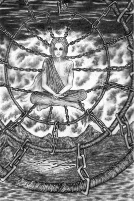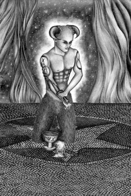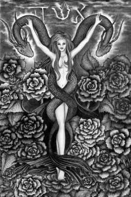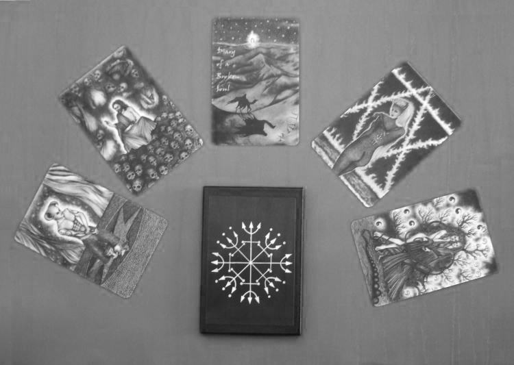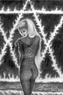This astounding tarot was created by Ash in exquisite pencil drawings. The jpg illustrations shown here cannot do justice to these finely detailed drawings, one has to see the printed images up close to fully appreciate them. There is a narrative underlying these images, in which Ash explores a journey of the soul through an allegorical landscape filled with intense experiences and inner trials. Ash achieves a wonderful marriage of vision and skill, neither dominating, and each at the service of the other. The textures of the skins of the various creatures, dragons and snakes, is depicted in incredible detail, and each card needs to be examined closely many times, to see all the imagery that Ash has woven into these images. On a first, superficial, glance at the artwork one might think these images reflect a bleak and dark vision, but Ash leads us through this towards an intensely charged and intriguing magical world.