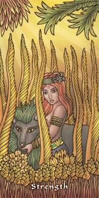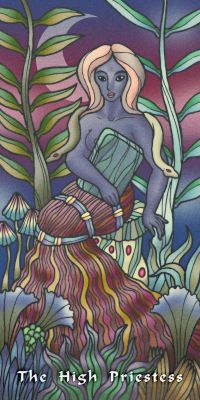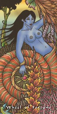 This is one of the wonderful designs of the prolific Philippine artist Lynyrd Narciso. It bears the title in old Filipino Tarot ng Daigdig sa Balintataw which translates to "The World inside the Pupil" (the black part of the eye). Narciso's art is anchored in strong underlying drawing, which he has coloured with subtle muted tones keyed to a tight palette. He uses a rather neat technique of altering the contrast in the line drawing so as to create a background, middle ground and foreground to the forms. He adheres closely to the tarot archetypes, but presents them in a new stylised and entirely coherent manner, especially using leaf and feather forms. Available now ! The retail price is £40 ($75). Postage to UK and Europe is £2. Postage to the USA and Rest of the World is $8.