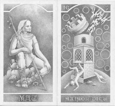 From the dated signatures on some of the cards these designs were created in 1981-3. These were printed in card form in 1995. The designs were also shown full page in Nadine and Michel Auzas-Mille 'Les 22 Portes', Editions du Cosmogone, 2007.