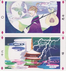 The Japanese style Better Luck Tarot was a free gift issued with a magazine. It is unusual as it adopts the landscape format. The imagery refers to traditional images from Japanese art, but drawn with a modern line and soft colouring. The artist uses a canvas texture for the backgrounds, which is likely to have been created digitally.