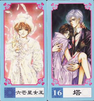 Angel Sanctuary is a shojo manga series written and illustrated by Kaori Yuki. Originally serialized in Hana to Yume from February 1995 to February 2001, it was later released in North America in an English language version. This is essentially a collectable produced for fans using art work from the manga, and there seems little tarot content. Some images are printed in landscape format. The cards are printed with a standard border and titles, which is used in a number of related tarots produced by this company. The cards are packaged in a tough polythene box. This contains a booklet, which was reused with different image on the cover in other tarots issued by this company.