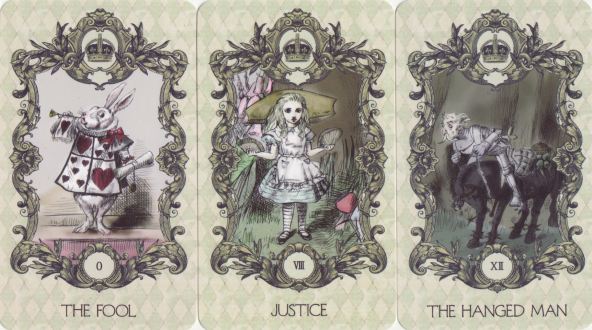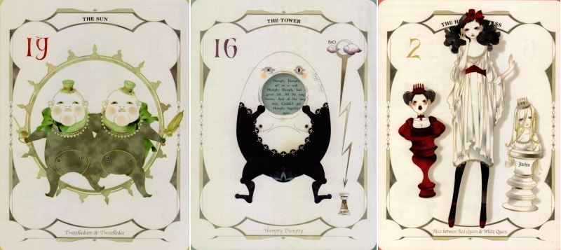26 November 2015 On the third of November I drew attention to a number of decks inspired by the Alice in Wonderland theme. On Monday while adding Korean material to my database I found that I had another fine tarot on this theme. The Tarot Card Alice book and deck issued in Korea in December 2011 uses the original illustrations of Tenniel to Alice in Wonderland and Through the Looking Glass. These have been subtly and sensitively redrawn and coloured without overwhelming the underlying drawings. At first glance one would think the colouring was through watercolour, but on close inspection this appears to have been done digitally in watercolour style.