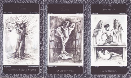 10 April 2011 Yesterday the Tarot de los Antiguos (The Ancient Tarot) arrrived in the post. It was created by the Spanish artist Miguel Angel Lopez Melgarajo and published in 2010 by one of the leading esoteric publishers in Spain, based in Barcelona. Born in 1960, Melgarajo had a series of spiritual experiences between 1984-87 which coloured and influenced his artwork. For his Tarot de los Antiguos he took the standard 22 major arcana and added a further 14 to make a grand total of 36 cards. The extra cards are a series of abstract ideas - The Mask, Love, the Cross of Another, Conscience, Power, Freedom, Mystical Revolution, Transcendence, Imagination, Will, Faith, Silence, The Form, The End - The Beginning. Melgarajo is known for his life drawing, so many of the figures in these cards are wonderful nudes.