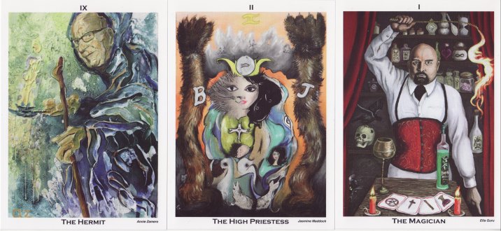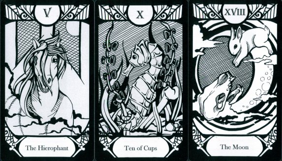 24 June 2014 The Animalis Os Fortuna 78 card deck has some wonderfully bold and confident pen drawings of animals set in tarot tableau. It was created by Megan Weber who uses the nom-de-plume Zaheroux. You can see many examples of her work on Etsy, Deviant Art and other image sharing sites. Her colour work is also very fine. Anyway it is great that she turned her attention to create this tarot which is available through the Game Crafter at a reasonable price.