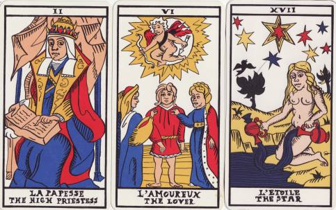 14 September 2010 There are few countries in the world which have not produced a tarot deck. Recently I bought two from Tahiti in French Polynesia, well actually from Moorea a smaller island which has only 16,000 inhabitants. Somehow a publisher Les Éditions du Lézard (the yellow lizard is the emblem of Moorea), issued two decks, probably in the 1980's. The 22 Tarots Divinatoires designed by J.R. Kahn, was created in pen drawings with coloured pencils. The art is amateurish but well realised. It does not seem to be mentioned in Kaplan's Encyclopedia and I had not heard of it until few days ago. It is a rather rare item I suspect.