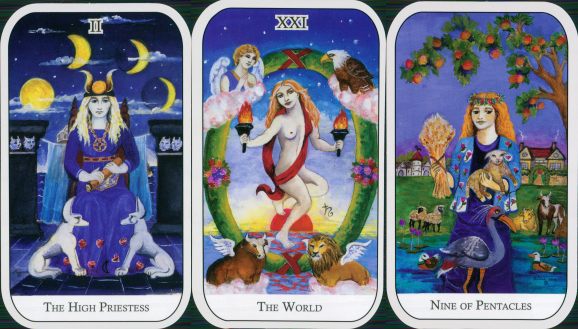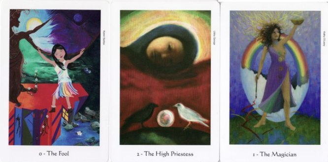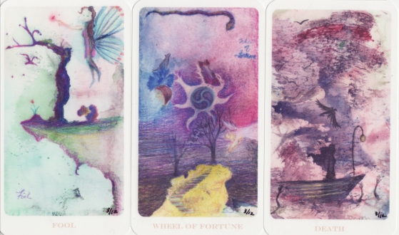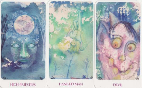 9 May 2011 Beth Seilonen's latest tarot is called Awareness. She tells me it arose out of a feeling she had recently of being caught up in the fog of life. In this tarot she explores a new style. Many of her tarots are clearly delineated and speak immediately to us. For this deck the tarot forms are more submerged in layers of textured watercolour, like a film or fog. A very interesting approach. It is issued as a very small edition of only 12. Buy one soon.