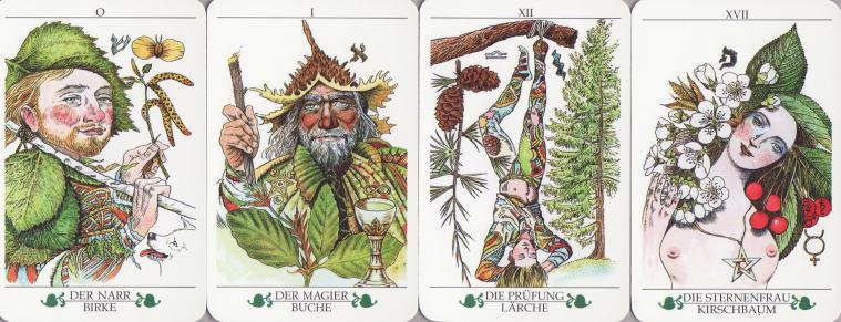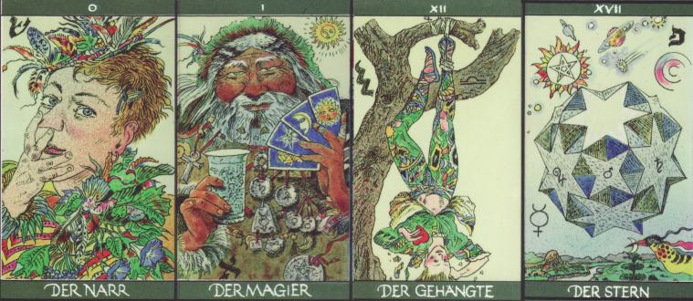 6 April 2011 A few days ago I bought a set of tarot designs printed for a book cover Im Haus der Gefiederten Schlange ("In the House of the Feathered Snake") by Frederick Hetman, published in 1990. The artwork is by Tilman Michalski. I was much impressed by the image for the Star which shows a polyhedron called a stellated icosidodecahedron, thus playing with the word as well as the image. I quickly realised that some of the artwork was very similar to that in Madru das Baumtarot published as a set of cards in 2000. This was also by Hetman and Michalski. Not all the images correspond but there is some obvious re-use of elements of the composition in many cards.