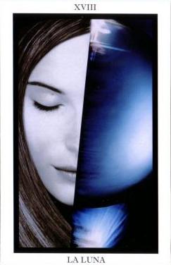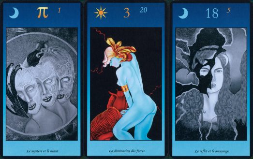 7 January 2014 Yesterday I received a copy of the Beatrix tarot. Its creator, Sylvie Breysse, is an artist particularly given to the use of the colour blue, often depicting the human body in luminous blue tones. She has created a number of sets of cards related to tarot including L'Oracle bleu, Le Voyage d'Iris , Chloe "le Miroir de l'Amour". The Majors for her Beatrix Tarot are renamed but the association with the arcana is still visible in the artwork. Twelve of the Majors are coloured and active, while the other ten are in monotone grey and passive. She is well connected to the world of celebrity in Paris, with the Italian-born French fashion designer Pierre Cardin being one of her supporters and a major collector of her artwork.