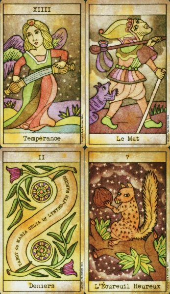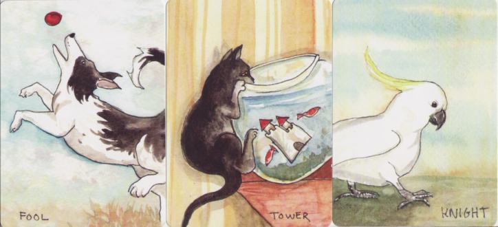 26 June 2014 Joanna Cheung's Animism Tarot presents some delightful painted portraits of animals set in tarot situations. Not a human in sight! Her paintings are beautifully muted and sensitive. Of course it includes an additional "Happy Squirrel" card