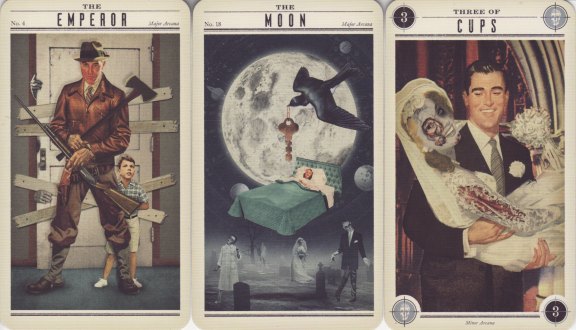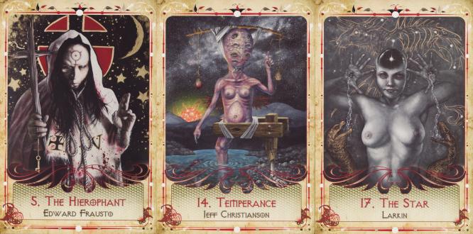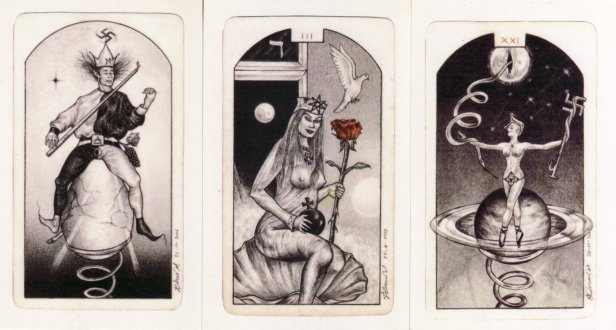 Three of Johfra's paintings and a drawing are shown on the right for comparison. 20 November 2015 There are a number of 'dark decks', tarot designs that dwell on the negative, dark side of humanity, often with images of grim horror and decay. We can recall such as the Tarot der Schatten, the Savage Tarot, the Marilyn Manson Tarot, the Devil's Tarot, the Alchemical Wedding Tarot and a number more. Well the Darkana has now joined this growing band of tarots that seem designed to excoriate and corrode the soul. Of course, this is a pose and high style in some communities, and not really to be taken that seriously. Like some others, the Darkana adopts a palette almost devoid of colour, with a background texture of inkblots and scratches. Imposed on this are digitally modified photographs in grey tones. Often the imagery on the card is perverse, the opposite of the stated meaning of the card. Thus the smiling Queen of Cups with "Loving empathy" fires off an Uzi machine pistol gangster style, the Two of Swords has a conventional image of a pair of scissors, but at the bottom left is a young child handling a bomb consisting of some sticks of gelignite set with a timer. The pregnant Empress holds up a child wearing a gas mask. Some images are more positive, but one loses sight of this positivity in a grim dark sea. This tarot is entirely successful in what it sets out to achieve. It will, doubtless, appeal to a certain audience and, of course, this negative imagery is part of modern tarot art. It can be seen as the antithesis, and perhaps a response to, the delightful and engaging imagery of some tarots. Darkana is not without humour and irony, but it will hardly make one laugh out loud, or even bring a smile to the lips. I feel the need to collect such material in order to fully document aspects of our modern culture, to make my collection representative of all facets of tarot art, but I expect only a small group of collectors will rush to buy this set of dark arcana. You can buy copies from www.thegamecrafter.com