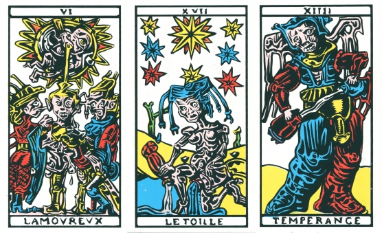15 December 2010 The Linol Tarot was created by Gerhard Haack in 1988 in Kassel in Germany. It is a full deck with minors and an additional card. It was issued as a signed and numbered edition of 150 copies. The images on the pip cards do not slavishly follow the Colman Smith emblems for the Rider Waite deck, but work within that style. The deck is said to be named after the supposed method of printing - linoleum block prints. I have examined the cards closely and cannot see how these could have been printed or even created as linocuts. It appears more likely that these are printed using serigraphy (commercial screen printing).