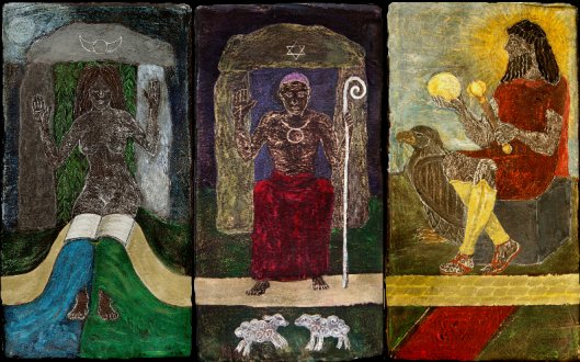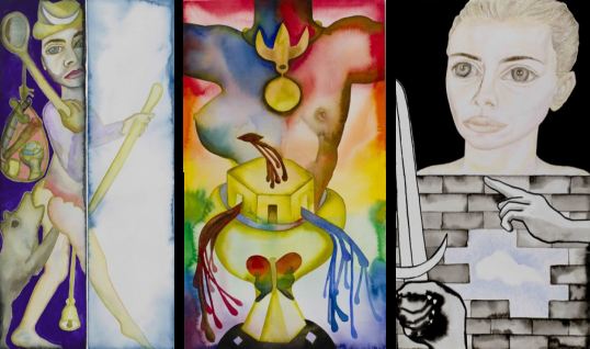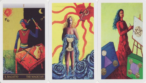 13 July 2014 A Francis Bacon Tarot ! Well not quite. We are still awaiting that one. But meanwhile we can look at the Tarot of Creativity by Aliyah Marr. This deck is illustrated with original paintings that were executed over a 15 year period. It started out as a conceptual art experiment in 2004 which resulted in her first deck, The Transformational Tarot, a digital game that was exhibited in national art shows. It clearly shows some influence of the painting style of Francis Bacon with some areas of details smeared over with dragged areas of paint. The Majors are renamed and do not all link to the established tarot imagery.