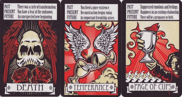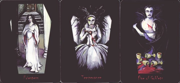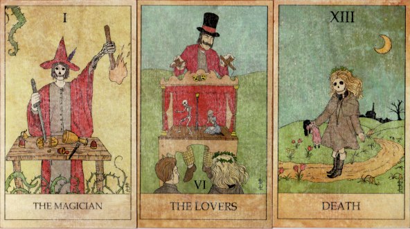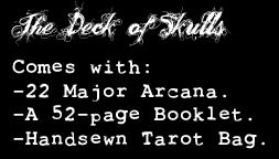 I don't usually buy decks that do not have a totally obvious tarot structure, but I could not resist the recently published Deck of Skulls by CJ Miller and Sarah White. There are twenty two cards, but these do not directly relate to the conventional tarot archetypes, though there are some resonances. It is available from SeriousWaffles. The dark Gothic artwork is what attracted me to the deck.