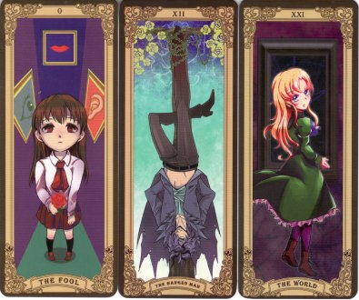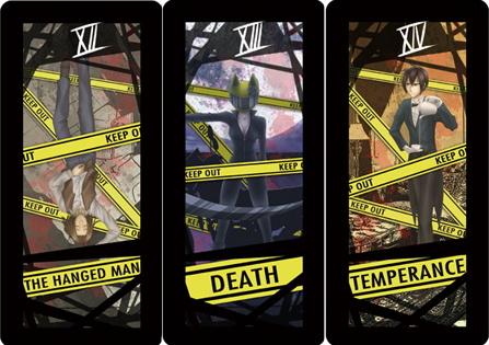 12 April 2011 Durarara is a Japanese light novel series written by Ryohgo Narita, which was adaptated into an anime which began airing in Japan in 2010. The series is about a dullahan working as an underworld courier in Ikebukuro, Japan, an internet-based anonymous gang called Dollars, and the chaos that unfolds around the most dangerous people in Ikebukuro. The heroine of the series, also known as "The Black Biker" or "The Headless Rider", is a dullahan from Ireland who came to Japan looking for her stolen head. Presumably she is the figure seen on the Death card. A game based on the series for the PlayStation Portable was also released in 2010. A Taiwanese fan of Durarara has now self-published a tarot based on the characters from this series. Each card, strangely, has "keep out" police style tape across the images. I have no ideas why this is so, but it may be this is referenced in the manga or anime. It comes in a rather fine quality black velvet pouch. I got my copy from the dealer Baby Dream, who sells these on Ebay at the moment.