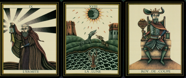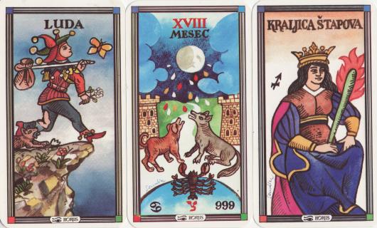 16 September 2010 The Horusov Magicni Tarot, a magical tarot issued by the publisher Horus, must be one of the very few tarot decks issued in Yugoslavia during the communist regime, before its break up that began in 1990. This deck was issued in Belgrade in 1989. It is a 78 card deck with designs by Sendain Tursic and comes with a book by Dragan Simovic and Tomislav Gavric. The designs are conventional with non-emblematic pips. I do not know of any other Yugoslavian tarots, indeed, until a few days ago I did not know of this one.