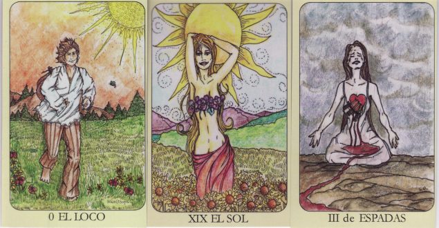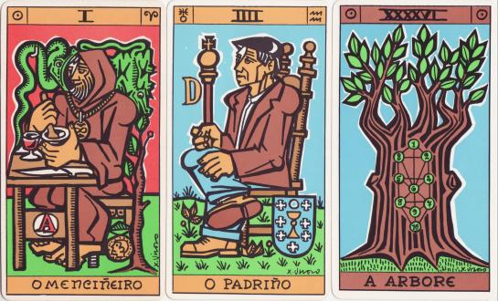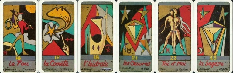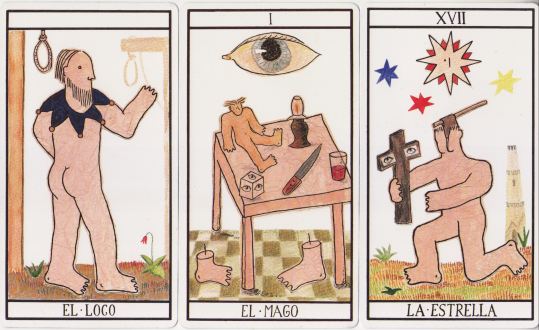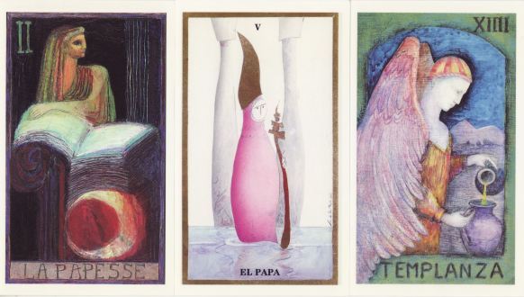 17 May 2011 I have recently bought a considerable number of tarots some of which I will post up here in the coming days. I was very gladdened to be able to obtain a tarot from the Canary Islands. This is the Tarot del Universo issued with a book by José María Doria apparently in 1989 at Santa Cruz de Tenerife. The artwork by Rafael Trelles is surreal with quite astounding and original images.