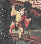 27 December 2010 I found this rather fine image of a fool in a painting The Parable of the Prodigal Son by the strangely named Master of the Female Half-Lengths, active around 1490-1540. This "Master" is the name given by art historians to a yet to be identified artist who specialised in half-length female figures. This painting is thus uncharacteristic of him and I am not sure how it became assigned to him. In any case, we have a rather fine image of a fool.