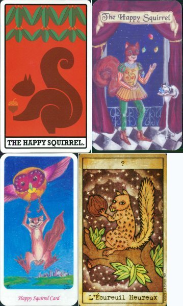 1 December 2015 In the mid 1990s an episode of the US cartoon series The Simpsons had a scene with a tarot reader. The character Lisa visits a tarot reader and during this she draws card XXIII 'The Happy Squirrel'. A few tarot artists, probably fans of The Simpsons, came to include a Happy Squirrel card in their decks. I noticed that Ly Narciso included this in his recent deck we looked at on the 18th November, and this led me to wonder just how many tarot include this. I can count nine, but there may well be more. Tarot de Maria Celia Touchstone Tarot Tierney's Delight Midnight Masquerade Tarot Collectors Forum deck 2009 Picture Postcard Mibramig International Icon Animism Robin Ator's International Icon of 2003 appears to be the earliest, followed a year or so later by Robyn Tisch Hollister's Midnight Masquerade. I would welcome notices of any I have missed from this provisional list.