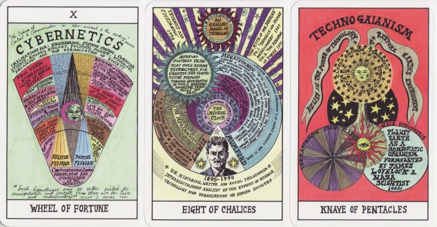 25 August 2010 When a new tarot arrives and one immediately sees from the packaging that the cards are larger than ones hands, then one can be almost certain that one is going to find an art tarot within the wrapping. This indeed happened this morning when I uncovered the Tarot MEM. The cards are 7.5 by 3.7 inches (190 x 93 mm) in size, printed on card and laminated. Some time ago 'MEM' Mark E. Merrill had been in touch with me about the possibility of my publishing his cards. There was a technical problem which made it impossible for me to do this, so it was good to discover a few weeks ago, that he had gone ahead and self-published the deck. Had I been able to publish his tarot images, I expect he would have been disappointed as there is no way I could have printed the cards at the size he has. His designs bring together many disparate visual ideas which are fused together in computer collage. I really liked the use of the image of William Burroughs, the wealthy member of the Burroughs family, who was a friend of Jack Kerouac and Allen Ginsberg and wrote many novels. On his card which is entitled 'L.O.D.' (the Land of the Dead), he is shown with the gun with which he accidentally shot his wife, the crab nebula nova remnant and thus a reference to one of his best known books Nova Express, and a centipede (perhaps a drug-induiced paranoid image which rather obsessed him, being mentioned in a number of his novels, particularly the Soft Machine). Mark Merrill's collages are full of such visual references.