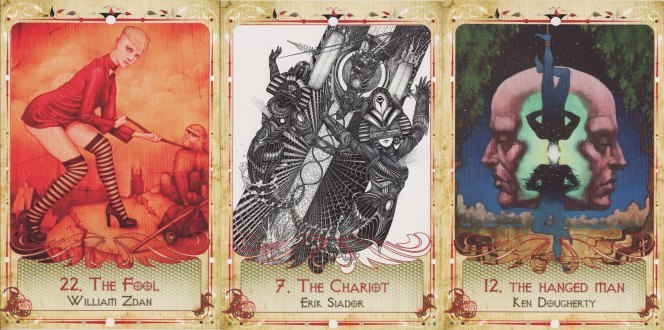 2 March 2011 I have been very busy over the last month or so with publishing books. I have been able to produce an art book of some of my coloured alchemical engravings. You can see this on my art weblog. This is not to say that my tarot collecting has ceased, indeed, I have continued to add some interesting items and have a batch of tarots on its way to me from Taiwan at the moment. So watch this space. Today, I will show the Hive Tarot which a colleague in Los Angeles managed to obtain for me. This was based on a collaborative art project by the Hive Gallery. These are big cards created to show the artwork and not intended necessarily for use as a working tarot deck. It was produced as a small edition of 100 copies, so it will be well worth collecting. The artwork is creative and playful, and some images are quite astounding.