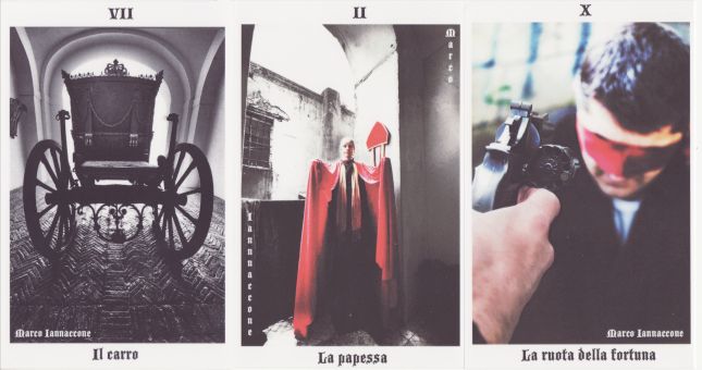 23 July 2010 Marco Iannaccone is a photographer in Naples. He has recently issued a tarot deck using his photographs. The deck incorporates black and white, coloured and some with areas in colour. These are not collaged, but for the most part are posed photographs. Being an art photographer we expect some intresting takes on tarot imagery. One which struck me was the Wheel of Fortune which shows an execution scene with a revolver the twelve chambers of which are empty except for one with a bullet. He only made a few copies and sold some recently on Ebay.