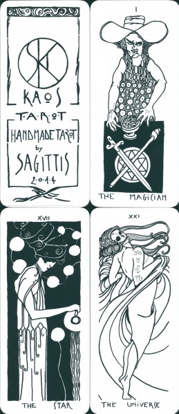 It would amuse me even more, if in a few years time, some tarot photo collage artist might use this image for the Hanged Man. 4 November 2015 The last of the three tarot I bought from the Italian publisher is the Kaos Tarot. This is a departure from the doll based images of the other two, and instead explores tarot imagery from a more surreal perspective. The line drawing using a number of different thickness of pens, is often contrasted with solid areas of black. The images can be easily read as reflecting the tarot archetypes, but in some cases are rather strange and original conceptions.