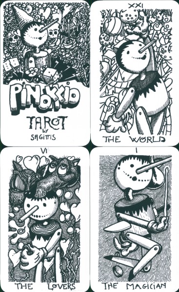 2 November 2015 I have rather neglected posting on this weblog, partly due to my opening a Facebook page www.facebook.com/tarotcollection/ dedicated to my Tarot Collection, however, I will begin posting material up here as well, as people seem to miss the Tarot Weblog. Last week I bought three tarots from an Italian artist, Sagittis, who works primarily in pen line drawings. I really admire the style, and a year ago I bought two tarots from this artist, one of which was the original artwork. Usually the printed editions are 50 copies. Few people seem to know of this artist who has produced around 10 or so tarots in two years. These appear to be sold primarily through Etsy. Anyway here is the recently issued Pinokkio Tarot, Majors only in black line drawings. The cards are large and presumably not intended for divination, but purely as works of art. I already have three other Pinocchio themed tarots - the Tarocchi di Pinocchio by Iassen Ghiuselev, the Tarocchi di Pinocchio by Armando Valcauda, and Tarocchio Massimiliano Frezzato. I will post up the other tarots I have by Sagittis, over the next few days.