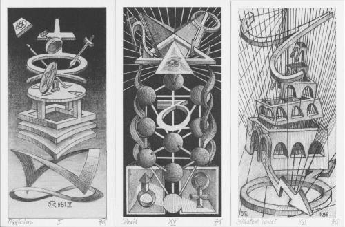 21 September 2010 In the last week or so I have managed to buy some tarots from a collection that was being sold off, that fill some gaps in my own collection. Among these is the JTG tarot by the German artist Johannes Tassilo Gruber in 1987. His original line drawings can be seen in Kaplan's Vol 3 page 269. Gruber must have reworked these into more detailed pencil drawings which model the surfaces, making his geometric forms appear embedded in three dimensions. He has a mastery of perspective and these difficult to visualise surfaces appear convincing and real. At first glance one might see this as mere surrealist abstract forms, but on more considered examination one realises that he uses geometric forms to abstractly model the tarot imagery. He makes many references to kabbalistic ideas, the four elements, the planets and the zodiacal signs, so this can be seen as a magical and esoteric deck expressed through geometric images. In my copy each card has the title, number and artist's signature added in pencil after the printing. One wonders that, after printing the cards, he thought the imagery required him to identify the individual cards. Hand labelling all 22 cards of the full edition must have taken a considerable amount of time. The edition size is 333, a reasonably large edition for an art tarot, but I have never seen a copy on sale. So when one appeared on the list of a collection being sold, I immediately bought it.