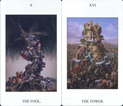 29 September 2010 I am beginning to work on a descriptive database of my collection which I am making available online as a finding aid or reference source for tarot art. There are many items to describe and as I cannot afford to drop everything else and merely work on this, it is likely to take a year or two. I will add items gradually. The first version of this with about 250 items now replaces the Tarot directory link. There will be one page for each tarot and I will try and implement a search engine over the next few weeks. 29 September 2010 Many of my fellow collectors do not like tarots as illustrations in books and prefer to limit themselves to those in card format. They miss out on many art tarots, as many of these are exhibited in a gallery as a series of artworks then issued in a printed catalogue. This applies to the Jak Flash Major Arcana which consists of a series of wonderful posed photographs. This series of photgraphs was the subject of an exhibition in Birmingham earlier this year. You can see details here. The book issued at the same time has very fine printed images. It is not especially expensive. Jak Flash is very inventive and finds some beautiful images for the Majors. The Tower can be a challenging image for artists, but here he has found a rather wonderful way of depicting it. The makeup on many of the models is astounding. He acknowledges special effects and artistic make-up artist Julia Hyland in particular. You will have to buy the book to see the artwork in full detail.